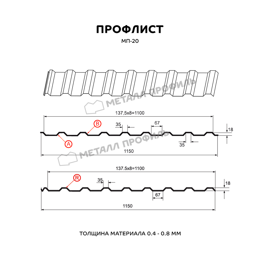Профилированный лист МП-20 является поистине многоцелевым стройматериалом. В отличие от многих других видов профлиста, этот изготавливается в трёх вариациях: А, В и R. Разновидности А и В применяются для кровельных работ, облицовки фасадов, монтажа заборов, для внутренней обшивки промышленных зданий, гаражей, ангаров и т.п. Профиль МП-20 с маркировкой R отличается присутствием капиллярной канавки и используется в качестве кровельного покрытия. В зависимости от области применения, данный профлист изготавливается из оцинкованной стали толщиной от 0,4 до 0,8 мм. Обратите внимание: хоть в названии указана цифра 20, на самом деле высота этого профнастила – 18 мм. Он является материалом бюджетной ценовой категории и имеет доступную стоимость. МП-20 – прочный и долговечный стройматериал, характеристики которого по достоинству оценивают не только частные домовладельцы, но и крупные застройщики. Он отличается хорошей жёсткостью, переносит значительные статические нагрузки и эффективно противостоит нагрузкам динамическим.