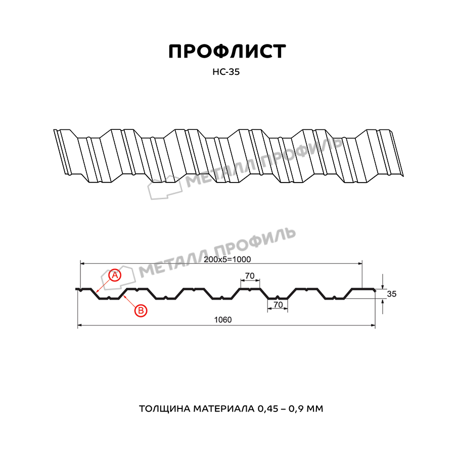 Многофункциональный и выгодный стройматериал с одинаковым с обеих сторон профилем. Маркировка НС говорит о том, что профлист является и «несущим», и «стеновым». Он пользуется популярностью как для гражданского строительства, так и при возведении крупных объектов. Из профлиста с высотой гофры в 35 мм создаются конструкции очень разного плана: каркасные здания ( цеха, торговые центры, склады ), быстровозводимые сооружения ( навесы, павильоны ), обустройство кровли, ограждения частных и городских территорий. Хорошую несущую способность НС-35 обеспечивают добавочные рёбра жёсткости, которые расположены с обеих сторон листа. Полезная ширина материала достигает 1000 мм при габаритной ширине 1060 мм, то есть при монтаже данного профиля в боковой замок уйдёт 60 мм. Толщина стальной заготовки колеблется в диапазоне от 0,5 до 0,9 мм – это обуславливает не только механическую стойкость профнастила, но и его вес. Полимерно-защитный слой из линейки Компани Металл Профиль добавит материалу дополнительную неуязвимость к коррозии и ультрафиолету.